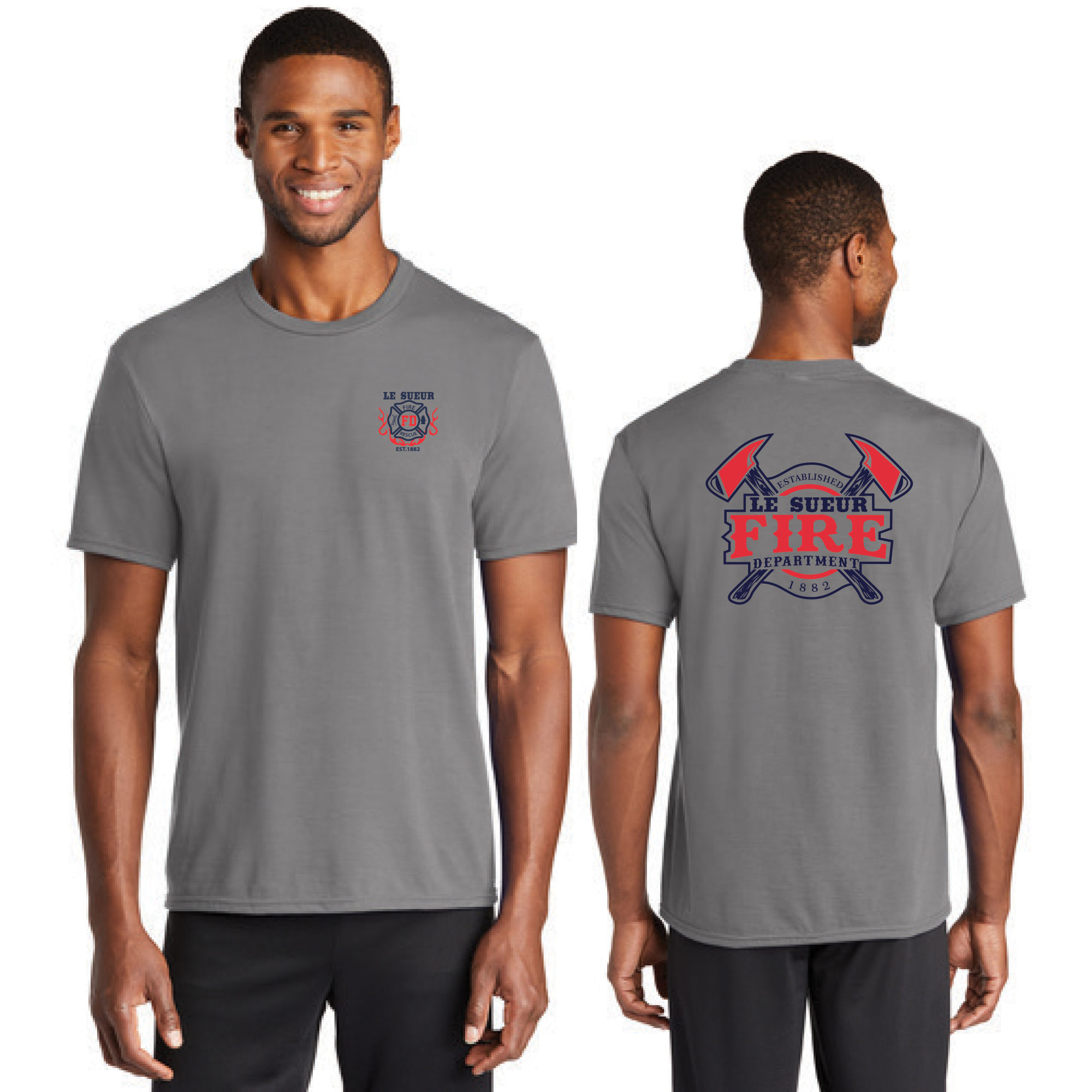 Features Le Sueur Fire Department screenprinted art on front and back of garment
