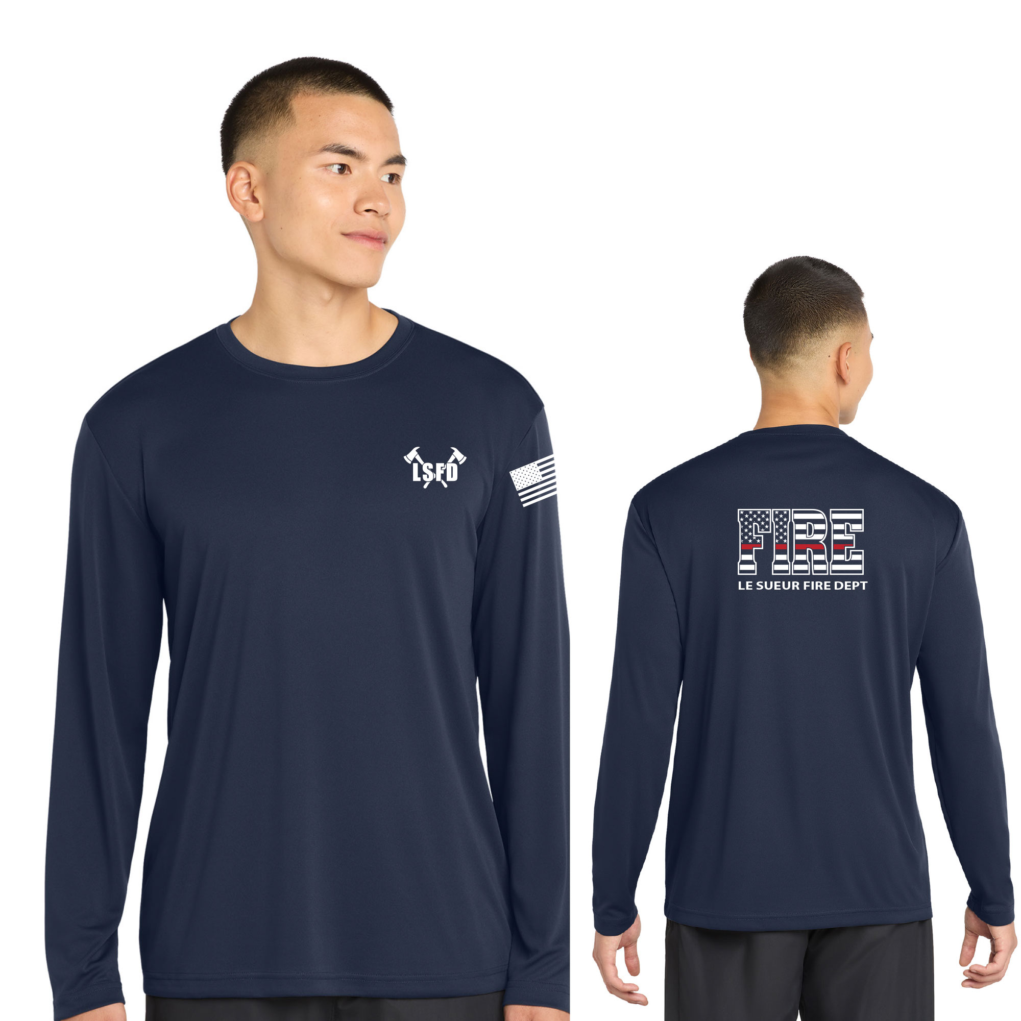 Includes Le Sueur Fire Department art screenprinted on front and back of garment with U.S. flag on sleeve